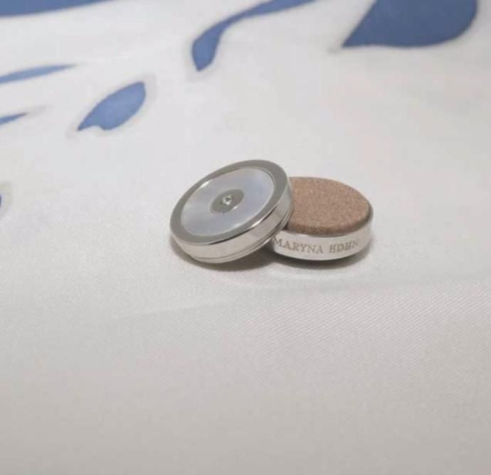 The object is made of steel, mother of pearl and is hypoallergenic. It is made up of two parts, the first used to receive the essential oil drops and diffuse the aromatherapy and the second, the magnet, allowing to stabilize the object on the face mask or any other thin fabric.